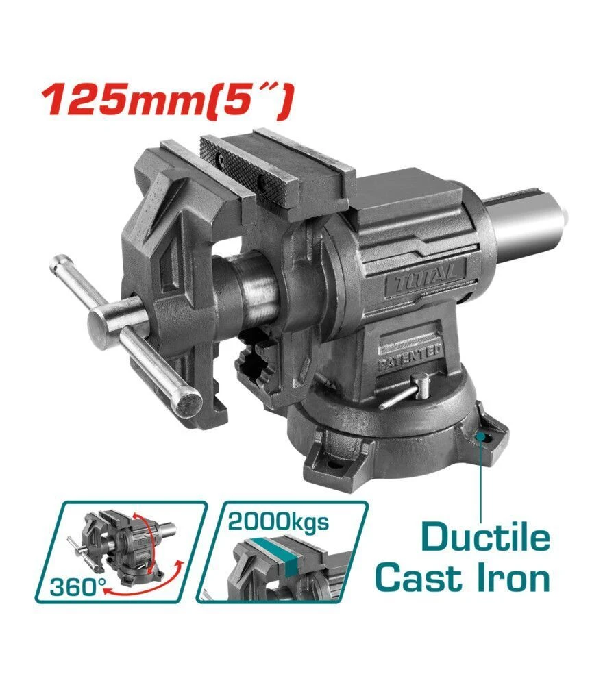 Лещата TOTAL THTMF6156 мають чавунний корпус, що витримує навантаження та забезпечує стійкість під час роботи. Поворотна основа дозволяє налаштовувати положення інструмента під конкретне завдання, а губки зі сталі забезпечують міцний хват. Ковадло додає функціональності, дозволяючи виконувати прості ударні операції без додаткових інструментів.