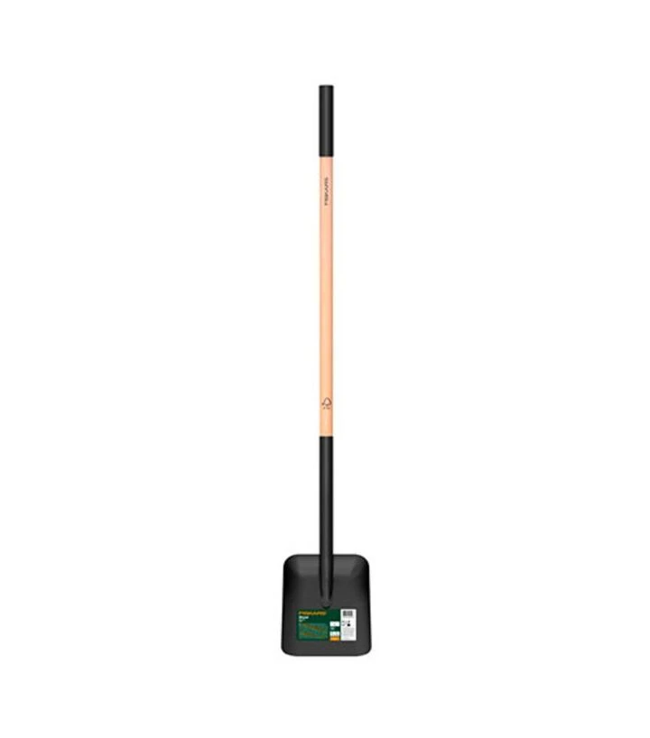 Лопата совкова з дерев'яною ручкою (L-подібна рукоятка) Fiskars Solid™ 1066724 - інструмент із широким сталевим ковшем і подовженим держаком для ефективного переміщення матеріалів. Міцна конструкція та зручна форма рукоятки забезпечують контроль і надійність у роботі.