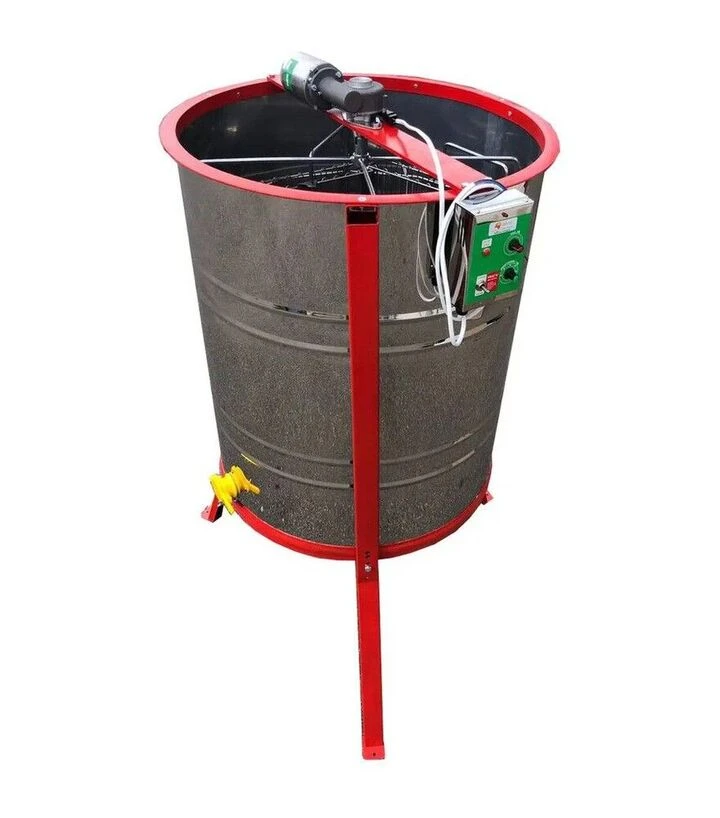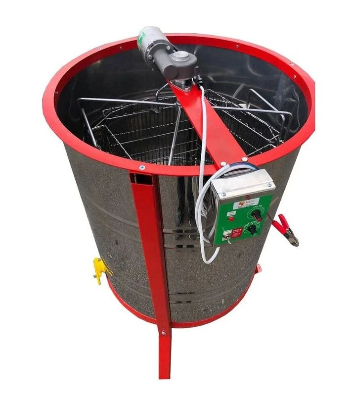 Медогонка 4-х рамкова поворотна нержавіюча, з горизонтальним електроприводом, з підставкою (MP0003NZ)Медогонка на 4 рамки з поворотними касетами, горизонтальним електроприводом та металевою підставкою призначена для відкачування меду на малих і середніх пасіках. Корпус і касети виготовлені з нержавіючої сталі, що забезпечує безпечний контакт із медом та спрощує догляд за обладнанням. Поворотний принцип роботи дозволяє відкачувати мед з обох сторін рамки без ручного перевертання, а підставка піднімає медогонку на зручну робочу висоту для зливу меду.
