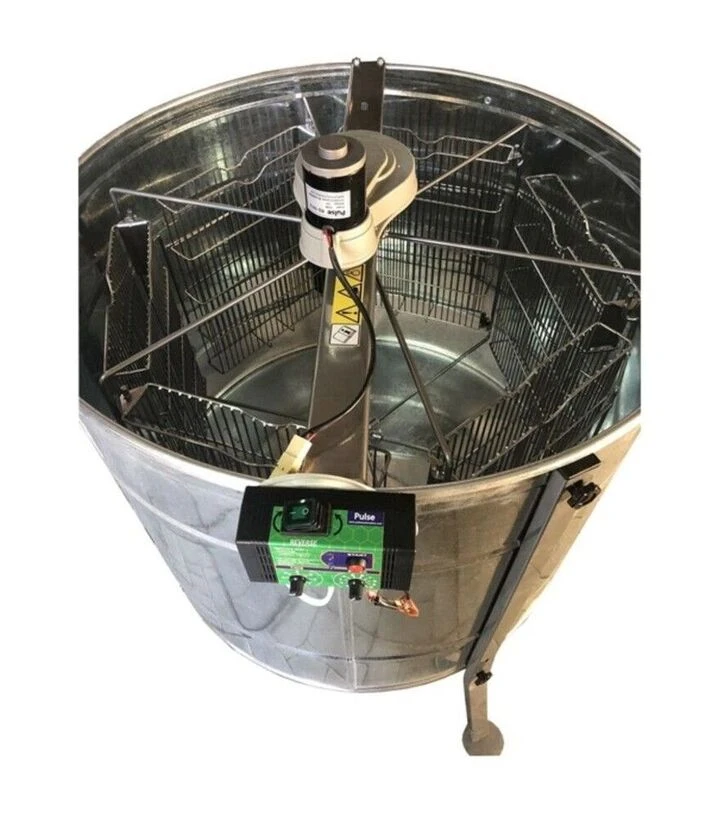Медогонка 6-ти рамкова напівавтоматична оцинкована, з ремінним електроприводом Pulse 100 Вт, з підставкою (MP006P)Напівавтоматична медогонка на 6 рамок з ремінним електроприводом Pulse та металевою підставкою призначена для відкачування меду на пасіках із середнім і підвищеним обсягом робіт. Конструкція розрахована на рамки «Дадан» висотою 300 мм та сумісна з іншими поширеними форматами. Оцинкований бак стійкий до вологи та механічних навантажень, а підставка забезпечує зручну робочу висоту для зливу меду. Медогонка підходить для регулярного сезонного використання.