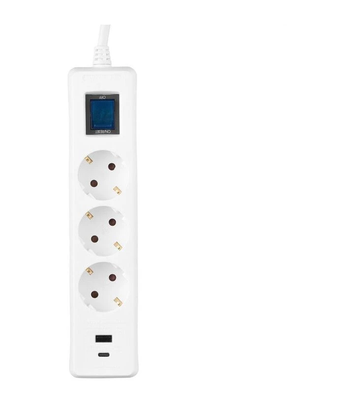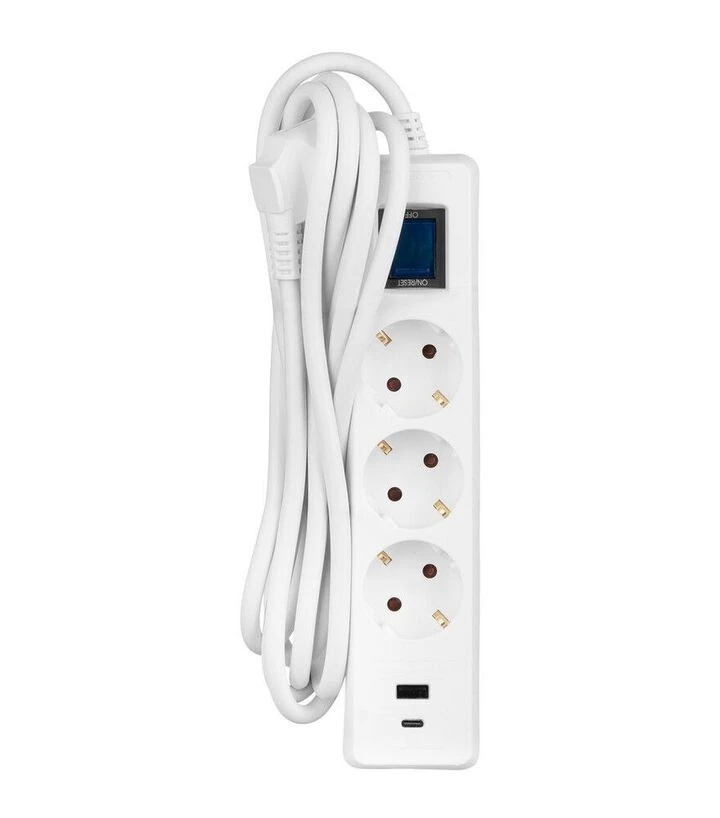 Подовжувач оснащений поєднанням стандартних розеток та USB-портів, що розширює можливості підключення техніки. Корпус виконаний у білому кольорі, а довгий кабель створює гнучкість у розміщенні. Захисний елемент реагує на перевантаження та вимикає подачу живлення при потребі. Конструкція розрахована на щоденне використання з різними типами побутових та офісних пристроїв.