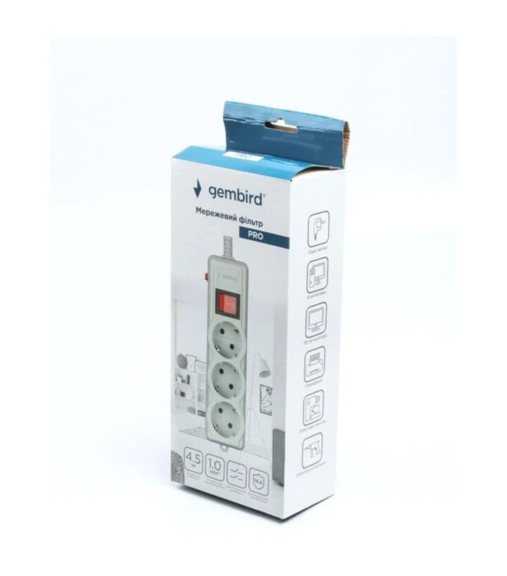 Мережевий подовжувач-фільтр Gembird 3 розетки, сірий, 4,5 м (SPG3-G-15G-PRO)Мережевий фільтр-подовжувач Gembird SPG3-G-15G-PRO призначений для безпечного підключення побутових та офісних приладів у мережах із нестабільною напругою. Пристрій має три євророзетки із заземленням та захисними шторками, що запобігають потраплянню сторонніх предметів. Варісторний модуль із реакцією <25 нс забезпечує захист техніки від коротких стрибків напруги. Завдяки довжині кабелю 4,5 м подовжувач зручно використовувати у великих приміщеннях, де розетки розташовані далеко від робочого місця.