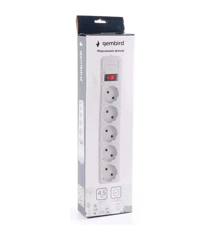 Мережевий подовжувач-фільтр Gembird 5 розеток, сірий, 4,5 м (SPG5-G-15G)Gembird SPG5-G-15G - це мережевий подовжувач-фільтр із п’ятьма розетками та кабелем довжиною 4,5 м, створений для підключення побутової й офісної техніки до мережі 220 В. Модель обладнана автоматичним запобіжником, фільтром захисту від стрибків напруги та універсальними розетками з заземленням. Корпус із ударостійкого пластику та наявність вимикача зі світлодіодною індикацією роблять пристрій практичним у щоденному використанні вдома чи в офісі.