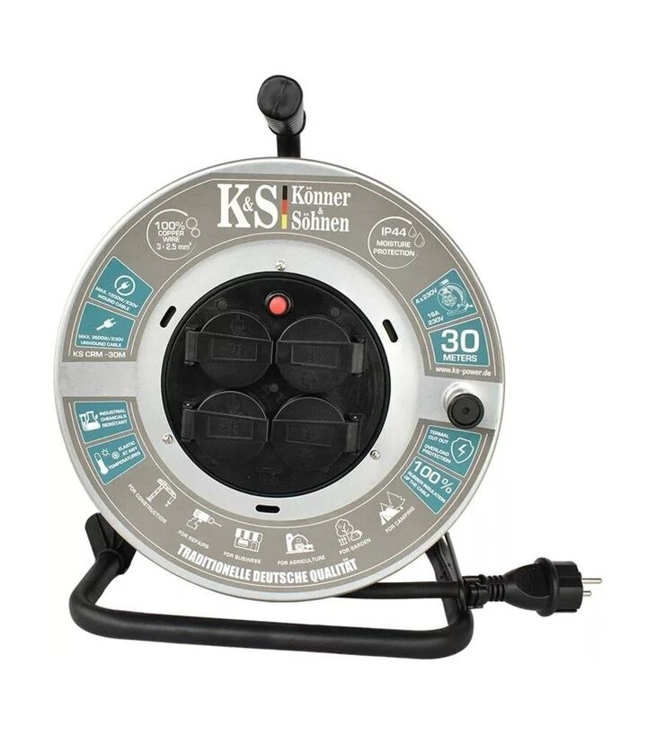 Konner&Sohnen KS CRM-30M оснащений металевою котушкою для намотування кабелю та чотирма розетками із заземленням. Конструкція дозволяє зручно зберігати кабель та швидко розгортати його на потрібну довжину під час роботи.