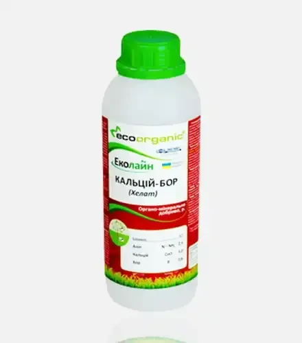 Еколайн Кальцій-Бор (Хелати) — це добриво для позакореневого підживлення плодових, овочевих та ягідних культур у період формування та дозрівання плодів. Містить кальцій (5%), бор (0,8%) і азот (2,5%) у формі, що швидко засвоюється рослинами. Сприяє якісному врожаю та підвищує стійкість до фізіологічних захворювань.