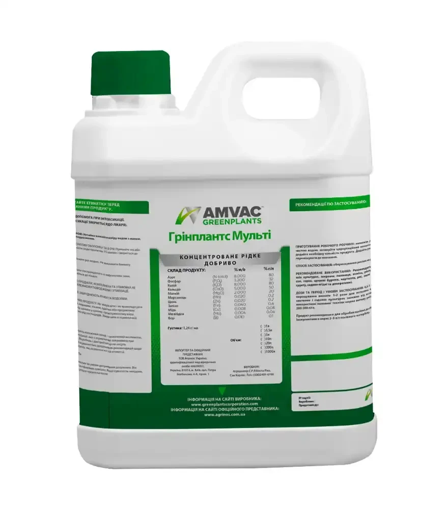 Zn, 0,2 г/л; B, 0,1 г/л; CaO, 50 г/л; Cu, 0,08 г/л; Fe, 0,4 г/л; K2O, 80 г/л; MgO, 20 г/л; Mn, 0,2 г/л; Mo, 0,4 г/л; N, 80 г/л; P2O5, 32 г/л |
