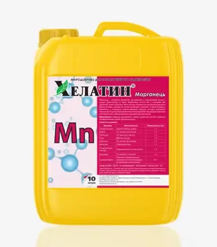 Рідке мікродобриво Хелатин Марганець застосовують для позакореневого підживлення більшості сільськогосподарських культур з метою забезпечення здорового росту та розвитку рослин. Поживна суміш містить у складі живильні елементи марганцю (Mn) та азоту (N) у хелатній формі, яка являється легкодоступною для рослин. Застосування добрива Хелатин Марганець має фунгіцидну активність проти ряду грибкових захворювань, сприяє засвоєнню азоту та запобігає появі кореневих гнилей. Підживлення Хелатин Марганець застосовують для обробки пшениці, ріпаку, соняшнику, кукурудзи, картоплі, огірків, томатів, кабачків, баклажанів, перцю, капусти, малини, полуниці, ожини, смородини, аґрусу, винограду, яблуні, черешні, персика, груші, вишні, абрикосу та інших культур.