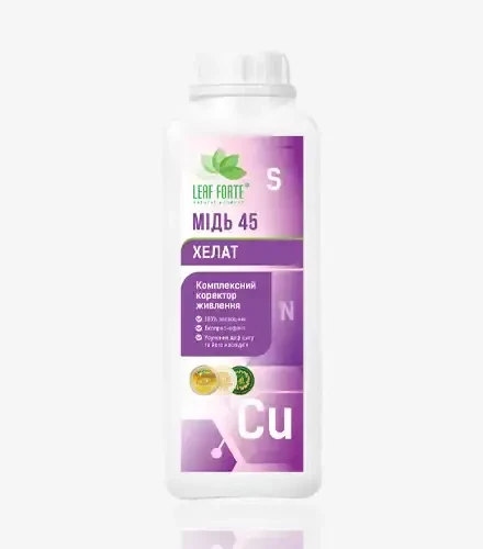 Мідь 45 Хелат — це мікродобриво на основі міді (Cu — 45 г/л), азоту (N — 60 г/л) і сірки (SO3 — 80 г/л), яке швидко усуває дефіцит цих елементів у рослинах. Випускається у вигляді розчинного концентрату, сумісного з іншими агрохімікатами.