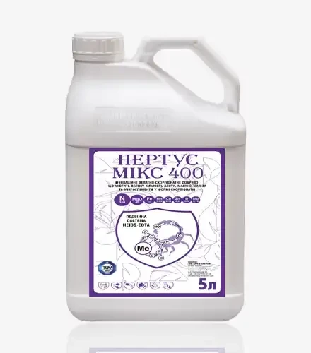 НЕРТУС МІКС 400 - високоефективне інноваційне хелатно-скорпіонатне добриво, призначене для листових (позакореневих) обробок широкого кола культурних рослин.