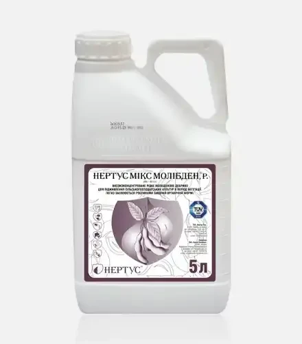 Нертус Мікс Молібден — це висококонцентроване рідке добриво, збагачене молібденом для ефективного підживлення сільськогосподарських культур. Його унікальна органічна формула забезпечує легке засвоєння рослинами, сприяючи їхньому здоровому росту та розвитку в період вегетації.