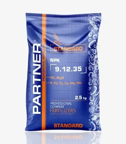 Standard 9-12-35+S+Mg+ME — це універсальне добриво з акцентом на калійне підживлення, призначене для забезпечення комплексного живлення рослин у другій половині вегетаційного періоду. Його формула ефективна для підвищення якості та збереженості врожаю, зокрема для овочів, ягід, баштанних, а також для винограду і ріпаку.