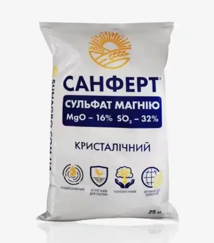 Сульфат магнію MgO-16% SO3-32% (кристалічний) - Добриво є високоефективним джерелом легкодоступних для рослин магнію та сірки. Застосовують для швидкої компенсації нестачі магнію або сірки шляхом фоліарного підживлення водним розчином або при фертигації. Добриво надзвичайно легко поглинається листковою поверхнею або кореневою системою рослин і є ефективним навіть за низьких температур.