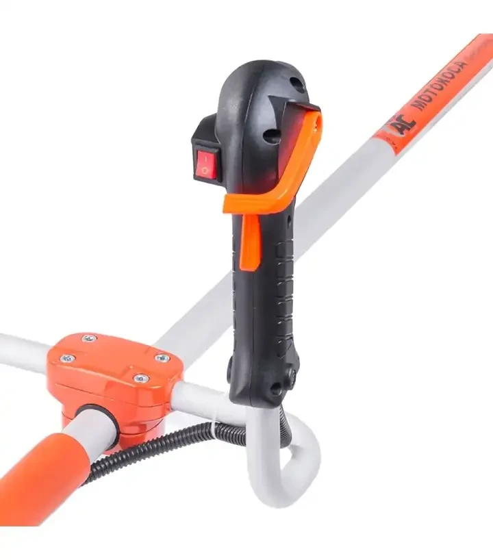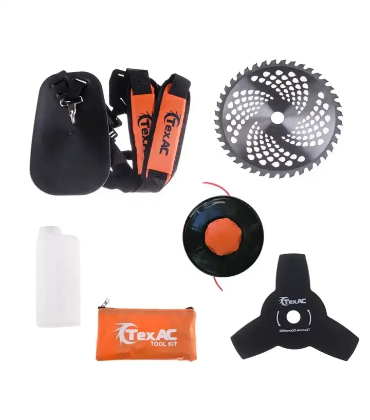 Комплектація: захисний кожух; ранцевий ремінь; шпуля; трьохпелюстковий ніж; ніж на 40 зубів; ємність для паливної суміші; свічний ключ; шестигранний ключ; комплект гвинтів; пружинний гайковий ключ; ручка для ножа; сумка для інструментів; інструкція; гарантійний талон