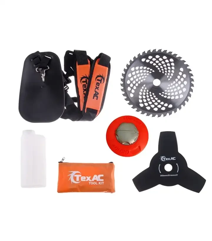 Комплектація: захисний кожух; ранцевий ремінь; шпуля; трьохпелюстковий ніж; ніж на 40 зубів; ємність для паливної суміші; свічний ключ; шестигранний ключ; комплект гвинтів; пружинний гайковий ключ; ручка для ножа; сумка для інструментів; інструкція; гарантійний талон