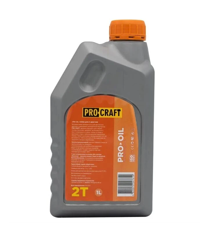 Моторна олива ProCraft 2T ProМоторна олива ProCraft 2T Pro призначена для двотактних двигунів. Напівсинтетична формула забезпечує надійне змащення, знижує утворення диму, допомагає уникнути нагару та корозії. Продукт сумісний із системами живлення як із карбюратором, так і з інжектором. Рекомендоване співвідношення змішування становить 1:50. Об’єм - 1 літр. Температурний діапазон застосування - від –30 °C до +120 °C. Виробником є бренд ProCraft - лінійка мастильних матеріалів, яка пропонується разом із інструментами та технікою. Компанія пропонує напівсинтетичні оливи, що відповідають основним стандартам якості для двотактних моторів.