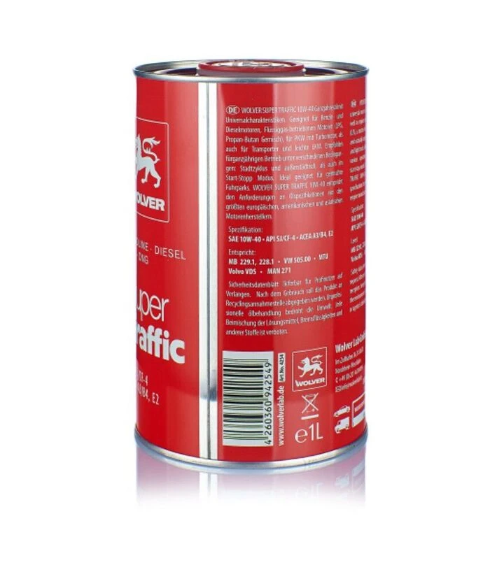 WOLVER SUPER TRAFFIC 10W-40 - напівсинтетична всесезонна моторна олива для бензинових, дизельних та газових двигунів (LPG, CNG) легкових авто, мікроавтобусів і легких вантажівок. Підходить для атмосферних і турбованих моторів, а також для змішаних автопарків. Склад оливи забезпечує стабільну роботу двигуна в міському циклі, режимах старт-стоп і підвищених навантаженнях.