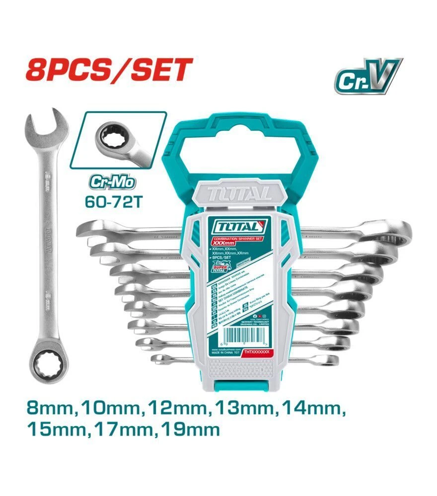 Набір TOTAL THT102RK086 поєднує класичні розміри гайкових ключів із перевагами храпового механізму. Таке рішення дозволяє працювати в обмеженому просторі й значно прискорює монтажні операції. Хромово-ванадієва сталь забезпечує міцність інструмента, а універсальна комплектація робить набір придатним для широкого спектра ремонтних задач.