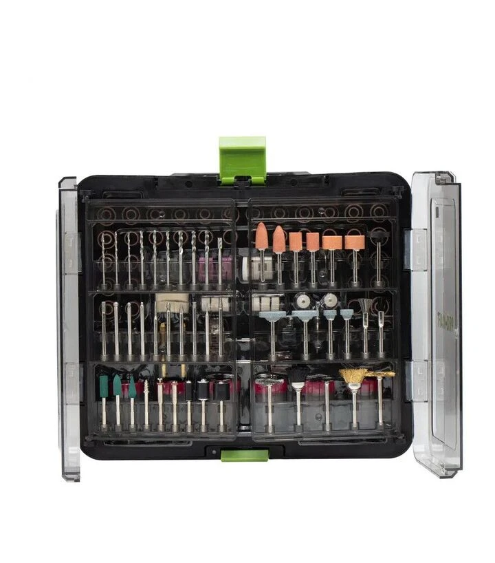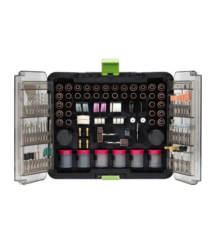 Набір поєднує насадки для чорнової та фінішної обробки, що дозволяє виконувати повний цикл робіт без підбору додаткових аксесуарів. Конструкція насадок забезпечує стабільну посадку в патроні гравера та рівномірну роботу на різних швидкостях. Кейс виготовлений з міцного матеріалу, що захищає комплект від пилу та механічних пошкоджень.