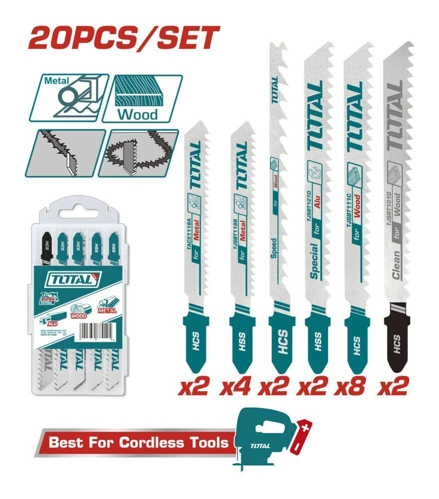 Бренд TOTAL відомий як виробник доступних витратних матеріалів і інструментів, розрахованих на широку аудиторію - від аматорів до майстрів у майстернях чи на будмайданчиках. Комплектація такої партії полотен відповідає практичним потребам: запас для багатьох робіт, різні типи ріжучих полотен, просте кріплення - без зайвих налаштувань.