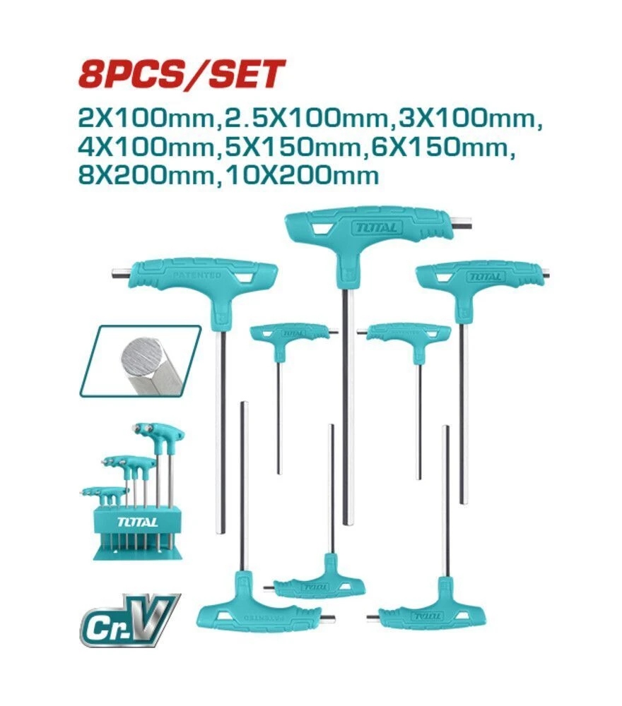 Набір TOTAL THHW80816 відрізняється Т-подібними рукоятками, які значно підвищують комфорт під час роботи з кріпленнями, що потребують більшого зусилля. Ключі виготовлені з хромово-ванадієвої сталі, що гарантує їхню міцність і тривалий строк служби. Різні довжини та розміри інструментів роблять набір універсальним для широкого спектра ремонтних та монтажних робіт.