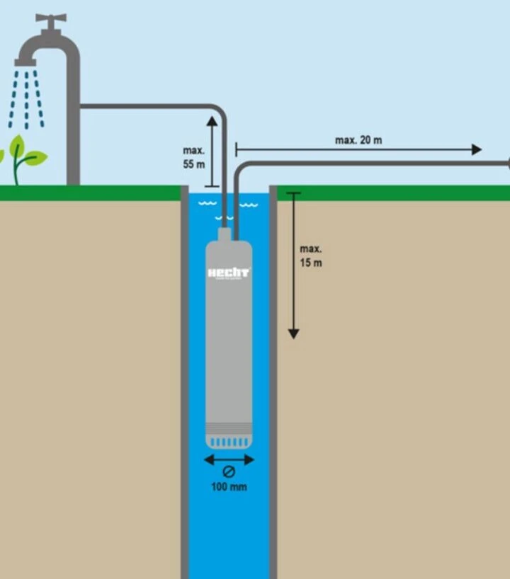 HECHT 3520 має надійну герметичну конструкцію, що дозволяє працювати у зануреному режимі без ризику пошкодження електричних частин. Він може бути встановлений у резервуарі або колодязі так, щоб перебувати на стабільній глибині під водою і забезпечувати стабільну продуктивність без зниження тиску чи ефективності. Висока нагнітальна здатність дозволяє подавати воду до верхніх точок трубопроводів або навіть до відкритих точок поливу без додаткових насосів.