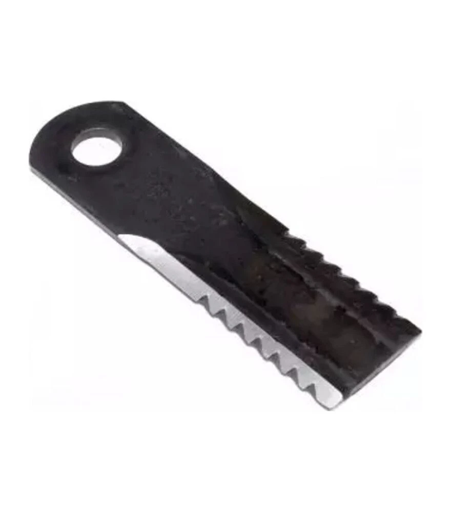 Зубчастий ніж подрібнювача використовується в роторному механізмі комбайна для подрібнення рослинних залишків після збирання врожаю. Його конструкція передбачає зубчасту ріжучу кромку, яка дозволяє ефективно працювати з різними типами рослинної маси, включаючи жорсткі та вологі стебла. Під час роботи ніж встановлюється на ротор і обертається з високою швидкістю, створюючи інтенсивний процес різання. Це дозволяє отримати рівномірно подрібнений матеріал та забезпечити його подальший розподіл по полю.