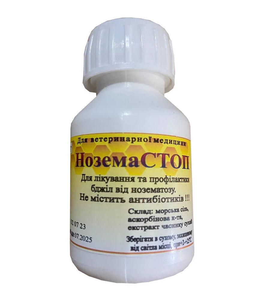 НоземаСТОП - порошкова добавка для профілактики та підтримки при нозематозі бджіл у весняно-осінній період. Препарат застосовують як компонент у цукровому сиропі навесні та наприкінці літа, коли зростають ризики ослаблення сімей. Склад поєднує морську сіль, глюкозу, екстракт часнику та аскорбінову кислоту, що працюють комплексно проти збудника Nozema apis і суміжних бактеріальних проблем. Засіб призначений для курсового згодовування через годівниці та не містить антибіотиків.