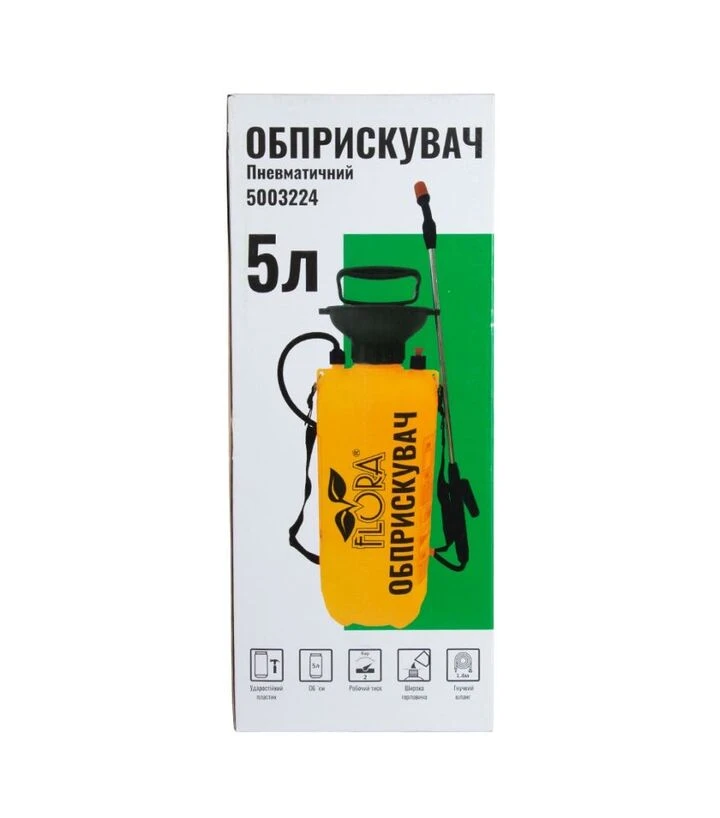 Обприскувач пневматичний Flora 5л (5003224) - пристрій для обробки рослин на присадибних ділянках, у теплицях і на городах рідкими засобами захисту рослин або добривами. Модель оснащена баком об’ємом 5 літрів і пневматичною системою створення тиску, яка забезпечує подачу рідини без електроживлення. Пристрій призначений для обробки невеликих і середніх площ, де важливий контроль над обсягом розпилення та точність покриття рослин. Обприскувач дозволяє регулювати форму струменя, що дає можливість переходу від точкового струменя до дрібного туману для різних завдань обробки. Flora - виробник садової техніки, орієнтований на побутові і напівпрофесійні рішення для обробки рослин. Модель 5003224 розроблена для користувачів, які потребують компактного, легкого і простого у використанні пневматичного обприскувача. Пристрій підходить для внесення води, добрив або засобів захисту рослин на присадибних ділянках, у теплицях і невеликих садах.