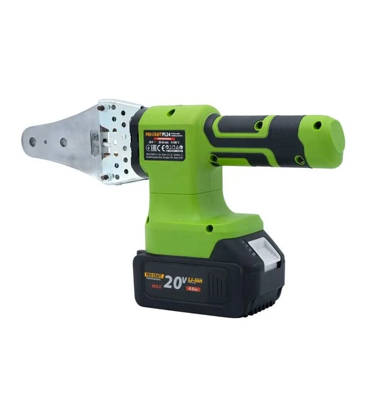 ProCraft PL-24 - акумуляторний паяльник для пластикових труб 20 В з температурою 0–340 °C, потужністю 280 Вт і двома ТЕНами. Підходить для діаметрів 20–63 мм, має індикатор заряду та регулювання температури. Акумулятор і зарядний пристрій у комплект не входять.