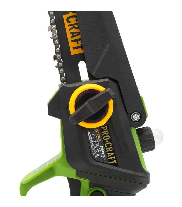 ProCraft PKA-46 - акумуляторна ланцюгова пила 20 В з шинами 6"/8", кроком ланцюга 1/4" і безщітковим двигуном. Швидкість ланцюга 6 м/с, безключове натягування та напівавтоматичне змащення роблять її зручною для регулярної обрізки та господарських робіт. Акумулятор і зарядний пристрій у комплект не входять.