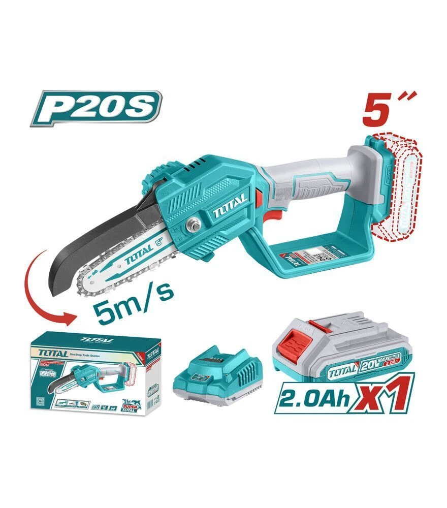 Пила-міні ланцюгова акумуляторна TOTAL TGSLI20581 Акумуляторна мініпила TOTAL TGSLI20581 - це ідеальне рішення для тих, хто шукає компактний, легкий, зручний і при цьому потужний інструмент для повсякденного використання в домашньому господарстві. Вона оснащена електродвигуном потужністю 250 Вт, що забезпечує достатній крутний момент для обрізання гілок, розпилювання дощок, заготівлі дров або підрізання кущів. Живлення від Li-Ion акумулятора 20 В ємністю 2 А·год дозволяє працювати без підключення до електромережі. Це дає змогу використовувати пилу на ділянках, у саду або просто на дачі без жодних кабелів чи генераторів. При цьому вага інструменту - лише 2,4 кг, що робить її надзвичайно маневреною та легкою в управлінні.