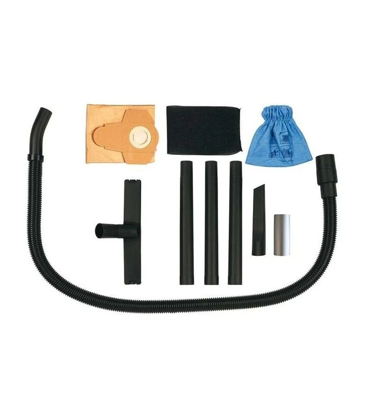 Пилосос оснащений шлангом довжиною 1,5 м та діаметром 36 мм. Максимальна сила всмоктування складає 80 мбар. Ударостійкий пластиковий бак об’ємом 15 л підходить для збору пилу, сміття або рідин. Передбачені насадки для підлоги, щілин та м’яких поверхонь. У комплекті також поролоновий фільтр, синій фільтр-мішок та паперовий мішок. Пилосос поставляється без акумулятора та зарядного пристрою.