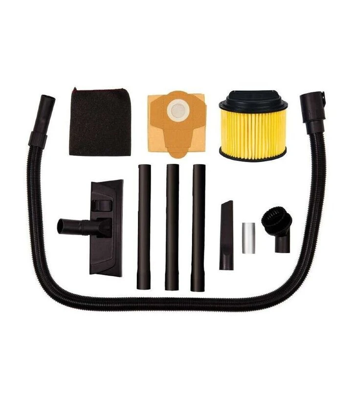 Пилосос оснащений всмоктувальним шлангом довжиною 1,5 м і діаметром 36 мм. Максимальна потужність всмоктування становить 80 мбар, що робить його придатним для різних типів забруднень. Конструкція передбачає стійкий бак із нержавіючої сталі, підставку на роликах та тримач аксесуарів. У комплект входять фільтри, насадки, подовжувальна трубка та мішок для сміття. Пилосос постачається без акумулятора та зарядного пристрою.