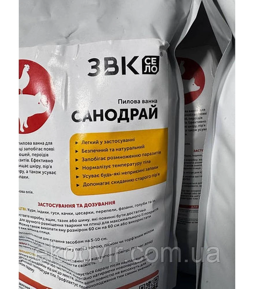 Організуйте ванну розміром 60×60 см (ящик, коробка, шина, яма) та заповніть її Санодраєм на 5–10 см. Можна змішати із золою, піском чи торфом у співвідношенні 1:1. Під час дощу ванну слід накривати.