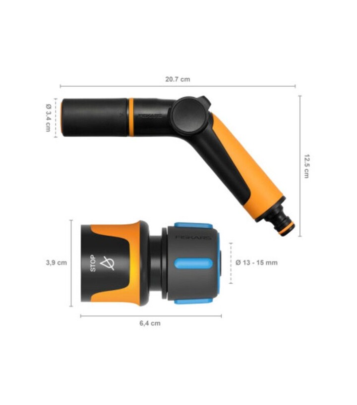 Набір Fiskars (1065493) - це компактне рішення для базового поливу та очищення ділянки. До комплекту входить регульований пістолет-розпилювач (1065487) із двома режимами роботи - потужний струмінь та ополіскування - і конектор для шланга 13–15 мм із функцією STOP (1027079). Пістолет має зручний важіль регулювання потоку під великим пальцем, що дозволяє плавно змінювати інтенсивність води. Матеріали корпусу стійкі до морозу, а універсальний роз’єм забезпечує сумісність з обладнанням інших брендів. STOP-конектор автоматично перекриває воду при від’єднанні насадки, спрощуючи роботу. Пістолет легкий (150 г) і зручний у використанні завдяки компактним розмірам.