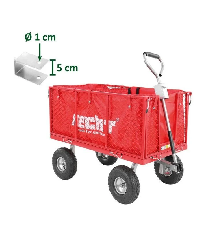HECHT 52184 - причіпний візок універсального призначення з великим об’ємом кузова і міцною конструкцією, що забезпечує комфортну транспортування вантажів у саду чи господарстві без зайвих зусиль.