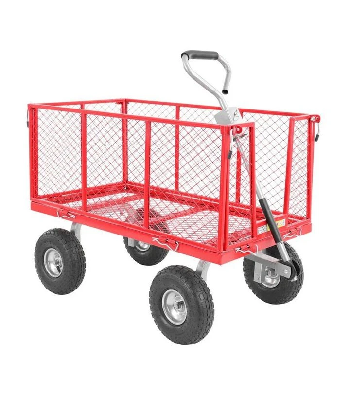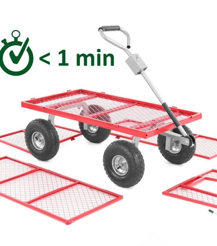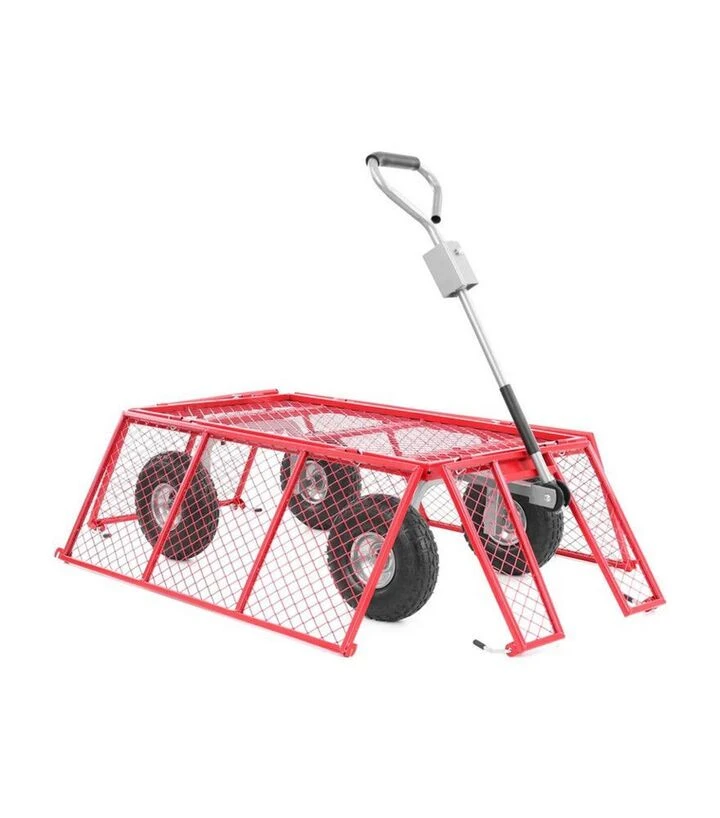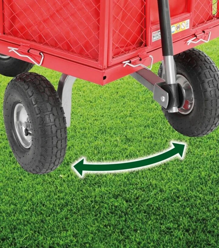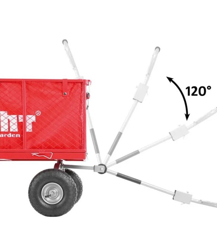 Візок оснащений чотирма колесами діаметром 25 см, що сприяють комфортному руху по різних типах поверхні - від твердих поверхонь до газону або ґрунтових доріжок. Чотири колеса підвищують стабільність конструкції та забезпечують рівномірний розподіл ваги, що важливо при перевезенні важких та об’ємних вантажів. Ергономічні ручки дозволяють легко управляти візком, виконувати повороти або зміни напрямку руху, навіть коли кузов заповнений повністю. Розміри кузова 965 мм у довжину та 040 мм у ширину дають змогу зручно завантажувати матеріали усередину, забезпечуючи достатній обсяг для великих обсягів робіт.
