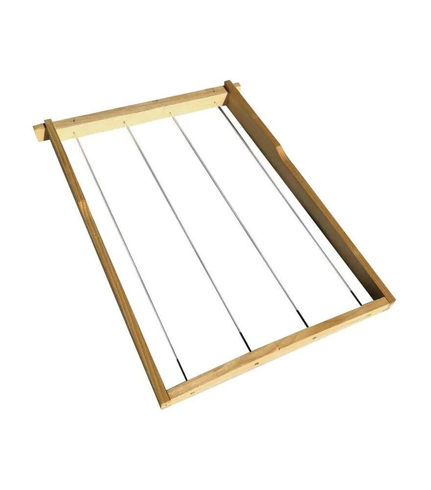 Рамка встановлюється у корпус Українського вулика та використовується для формування розплоду або розміщення кормових запасів. Натягнутий нержавіючий дріт забезпечує надійну основу для кріплення вощини та зберігає жорсткість рамки під час оглядів і роботи з гніздом. Латунні втулки зменшують зношування отворів у деревині та підтримують стабільний натяг дроту.
