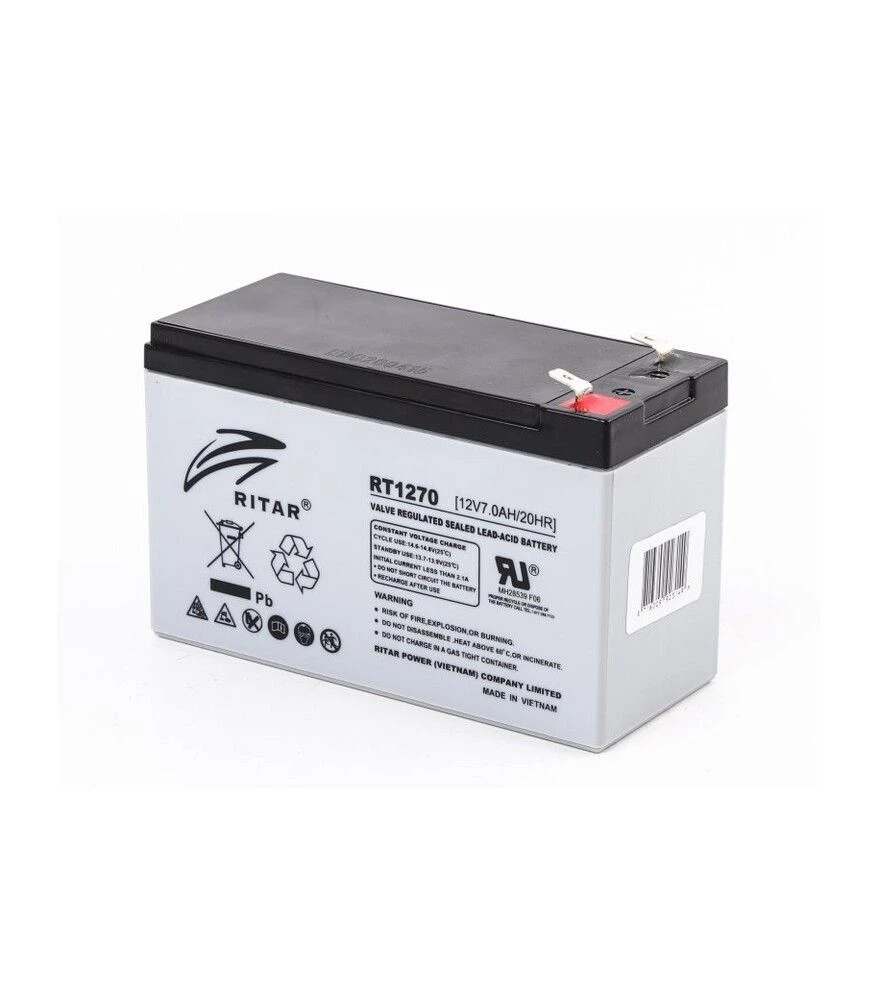 Аккумуляторная батарея Ritar AGM, 12 В, 7 A*ч (RT1270) предназначена для использования в системах резервного и автономного электропитания, где необходимо обеспечить стабильный источник энергии для электронного оборудования. Такие батареи применяются в источниках бесперебойного питания, телекоммуникационных системах, системах сигнализации, видеонаблюдения и сетях аварийного освещения. Номинальное напряжение 12 В обеспечивает совместимость с большинством устройств резервного питания, а емкость 7 А·ч позволяет поддерживать работу оборудования в случае отключения основной электросети.