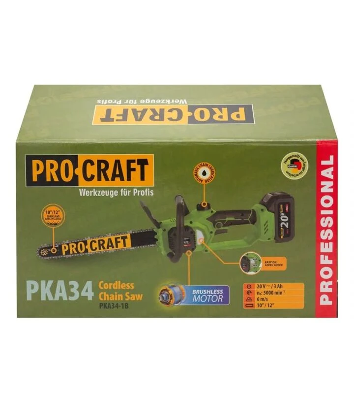 ProCraft PKA-34 - удобный инструмент для ухода за садом, заготовки небольших дров или обрезки веток в частном хозяйстве. Благодаря двум комплектам шин и цепей пила подходит для разных ситуаций - от мелких садовых работ до чуть более сложных задач. Автоматическая смазка упрощает обслуживание, а бесщёточный двигатель обеспечивает стабильную продуктивность и долгий срок службы.