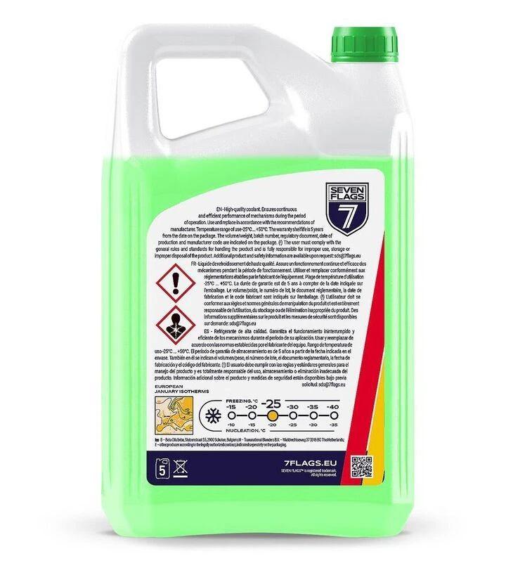 Антифриз 7FLAGS G11 зеленый - готовая охлаждающая жидкость для систем охлаждения двигателей легковой, грузовой и специальной техники. Поддерживает стабильную рабочую температуру двигателя, защищает от перегрева, коррозии и образования накипи. Работает при температурах до -40°C, обеспечивает надежность в холодный период и стабильную циркуляцию при длительных нагрузках.