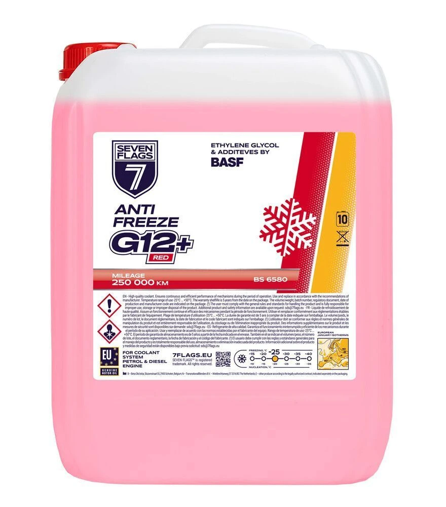 Антифриз 7FLAGS G12+ красный - готовая охлаждающая жидкость на основе моноэтиленгликоля для современных двигателей легковой, грузовой и специальной техники. Обеспечивает стабильный температурный режим, защиту от перегрева и замерзания до -40°C, а также длительную антикоррозийную защиту благодаря карбоксилатной технологии. Подходит для техники, работающей в условиях переменных нагрузок.