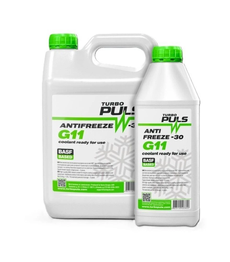 Антифриз TURBO PULS ANTIFREEZE -30 (G11) зеленый - готовая охлаждающая жидкость на основе моноэтиленгликоля для систем охлаждения двигателей автомобильной и стационарной техники. Обеспечивает стабильное отведение тепла, защиту от коррозии и работу системы при температурах до -30°C. Подходит для техники, работающей в условиях переменной нагрузки и различных климатических условий.