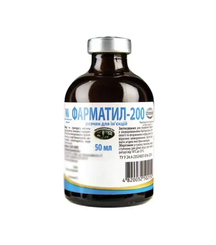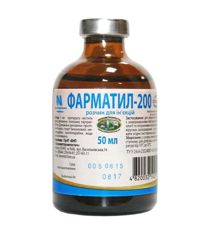 Антимікробний препарат Фарматил-200 розчин — антимікробний препарат на основі тилозину тартрату для лікування тварин при інфекціях дихальної, шлунково-кишкової та репродуктивної систем. Підходить для великої рогатої худоби, свиней, овець, кіз, індиків, собак, котів та кролів. Упаковка — скляний флакон 50 мл.