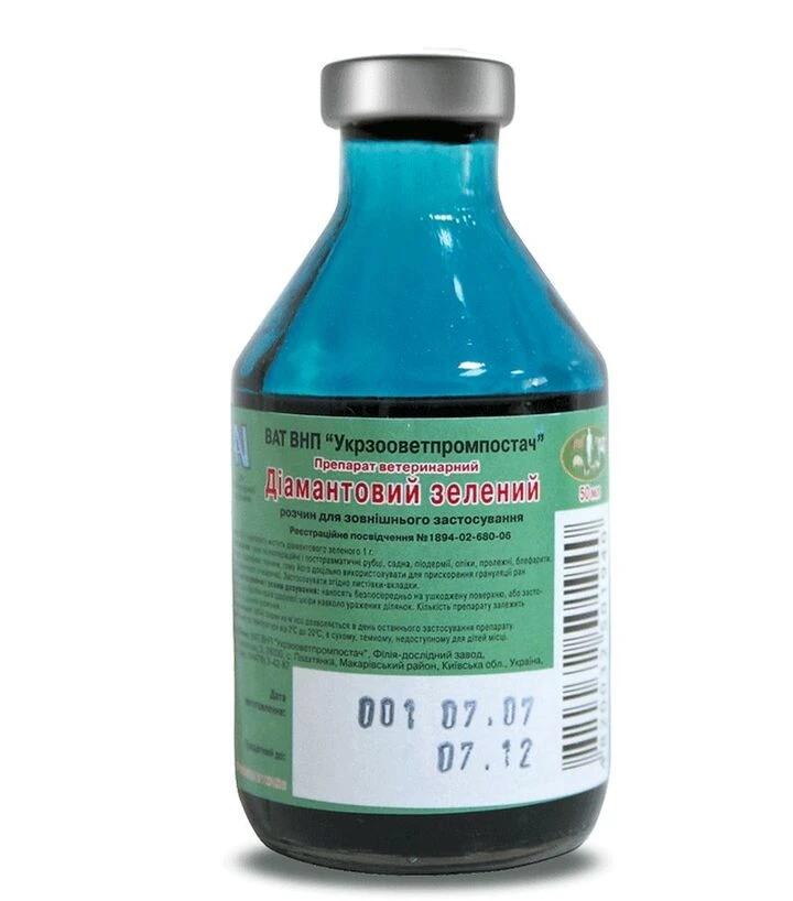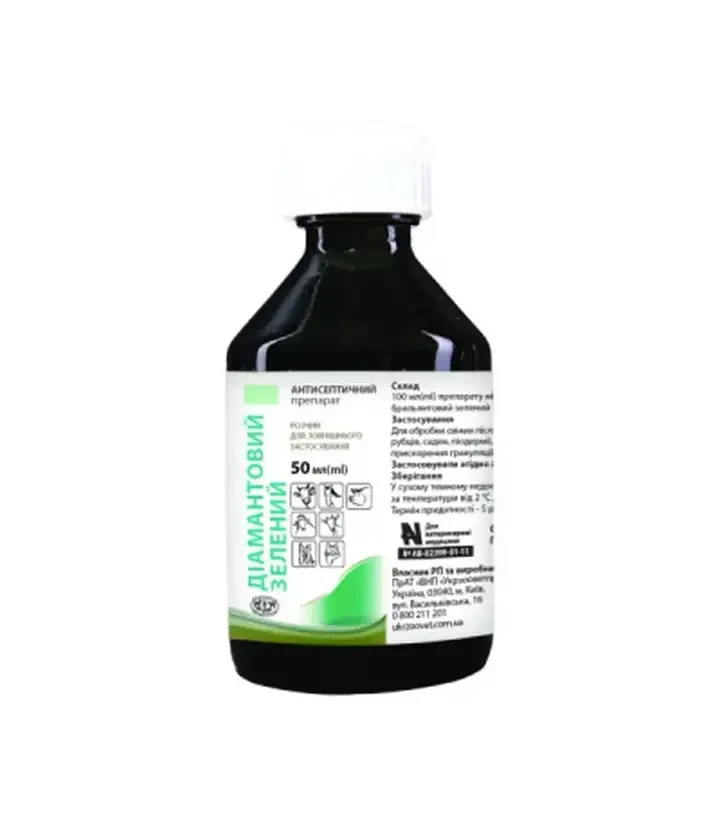 Антисептик Діамантовий зелений 1% (50 мл) — ефективний антисептик для зовнішнього застосування у ветеринарії. Препарат на основі діамантового зеленого швидко знищує грампозитивні мікроорганізми, сприяє загоєнню шкірних ушкоджень і попереджає інфікування.