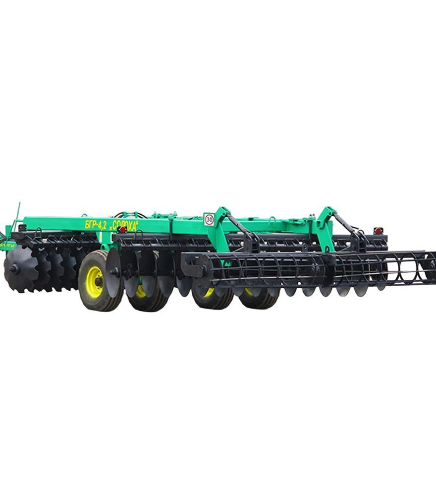 БГР 4.2 «Солоха» - агрегат, разработанный для интенсивной работы на больших полях. Полуприцепное сцепление обеспечивает эффективное распределение нагрузки между трактором и бороной, снижая износ навесной системы. Большая масса позволяет стабильно заглубляться даже на тяжёлых и пересушенных почвах. Конструкция упрощает техническое обслуживание, что важно при ежедневной работе в сезон.