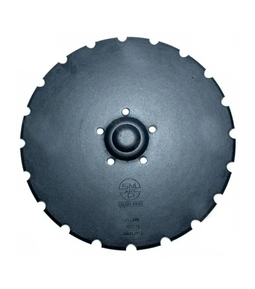 Диск изготовлен из борированной стали и имеет зубчатую форму «ромашка», что обеспечивает эффективное проникновение в почву и разрезание растительных остатков. Конструкция с пятью крепежными отверстиями позволяет надежно устанавливать деталь в узле сошника и поддерживать стабильную работу посевной техники.