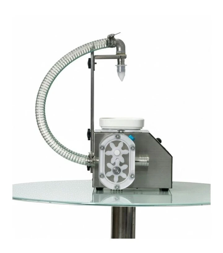 Дозатор для фасовки мёда GR 3500 автоматический (SHD3500) предназначен для розлива мёда в банки, бутылки и другую тару с контролем порции. Устройство работает с вязкими жидкостями и подаёт продукт через шланг и кран, что удобно для фасовки партиями без лишнего переливания. Корпус, насос и соединения выполнены из пищевой нержавеющей стали AISI 304, поэтому дозатор подходит для работы с продуктами. Во время фасовки система отмеряет заданную порцию и помогает поддерживать одинаковый вес в каждой ёмкости.