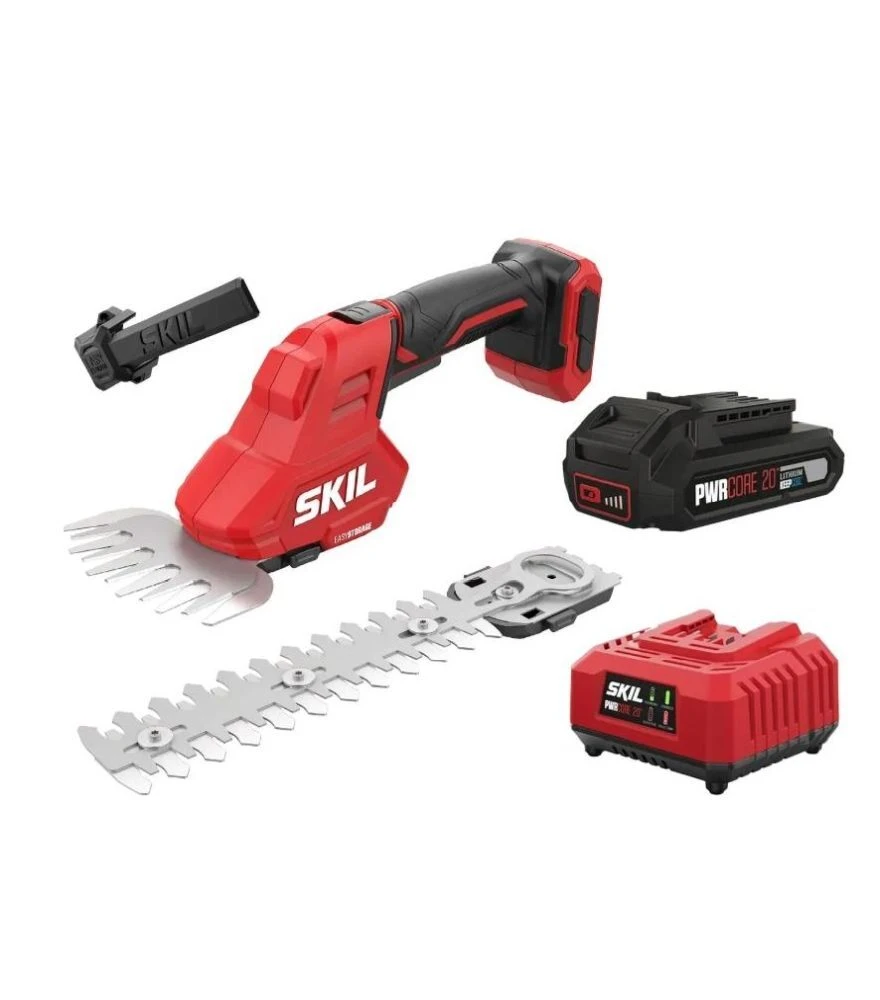 Комплектация: Електроножиці; АКБ 20В 2,5Аг - 1 шт; зарядний пристрій; насадка-кущоріз 20 см; насадка для трави; захисні чохли для лез