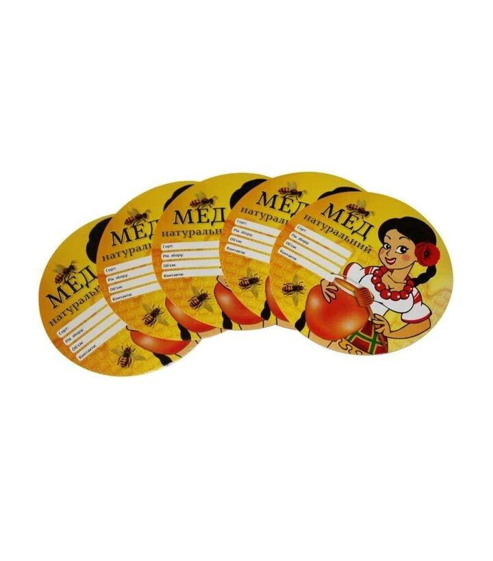 Этикетки упрощают маркировку мёда без печати под каждую партию. Круглый формат удобен для крышек, а бумажная основа даёт возможность быстро вносить данные о сорте, дате фасовки и контактах. Подходит для реализации на рынке, ярмарках и в магазинах.